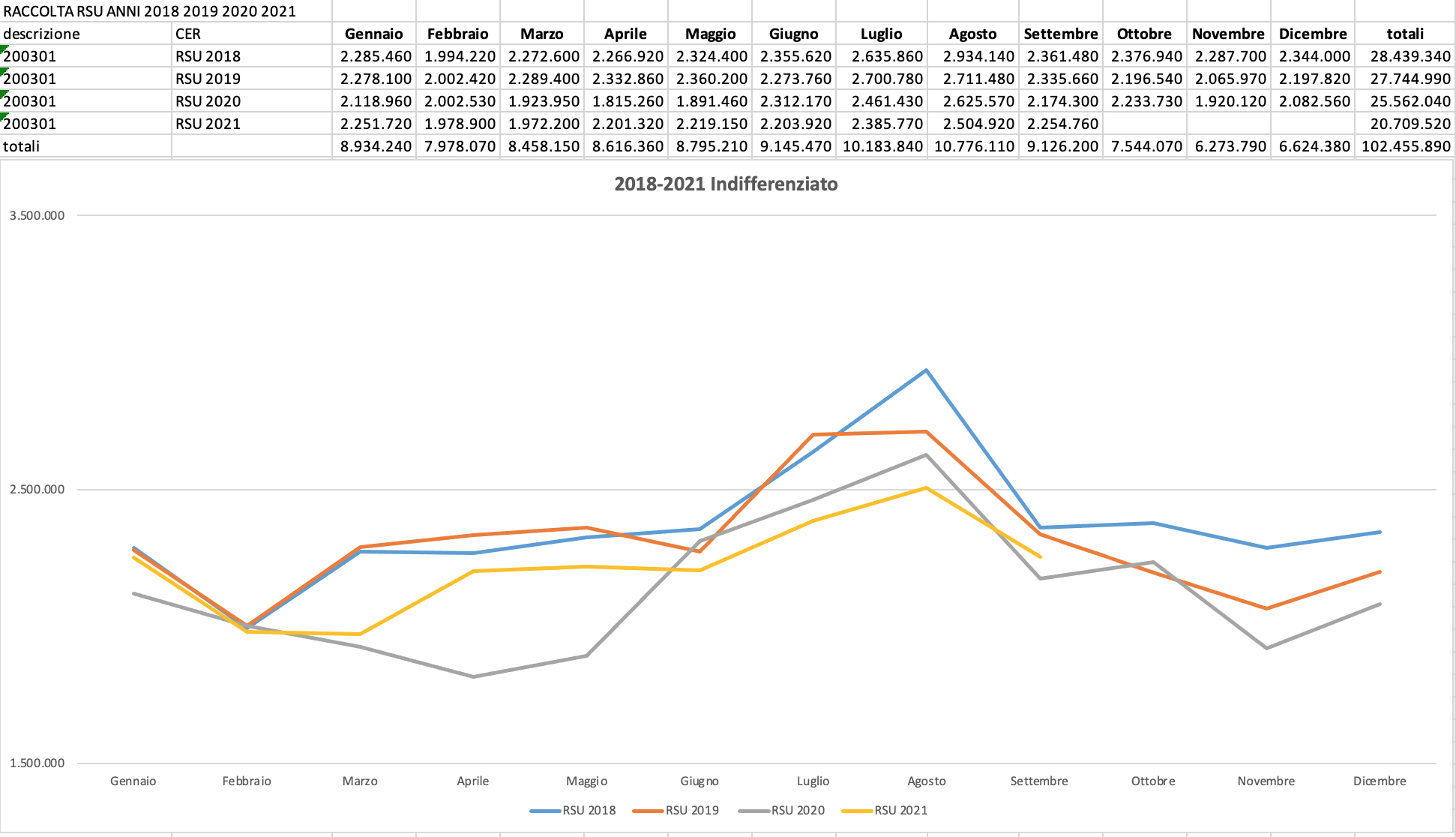 Nelle infografiche che seguono è illustrato l’andamento del monte rifiuti, con i volumi e le percentuali delle varie frazioni, registrato nel triennio 2018-2020; in calce il trend dell’anno in corso, aggiornato a settembre.