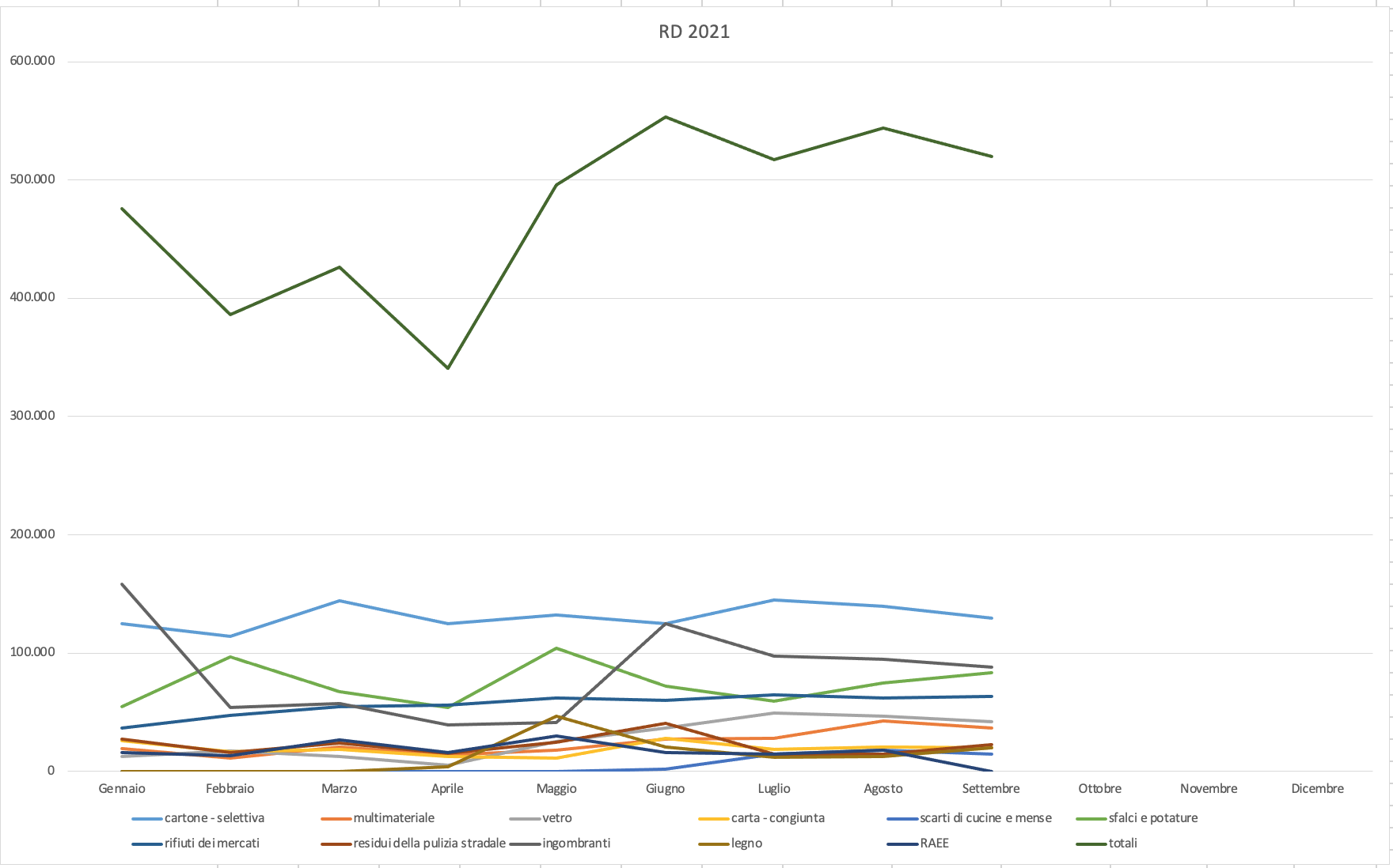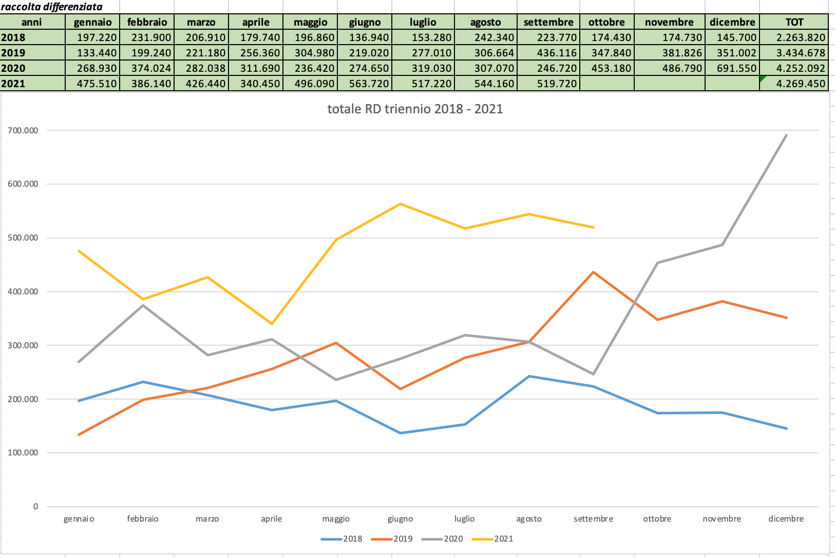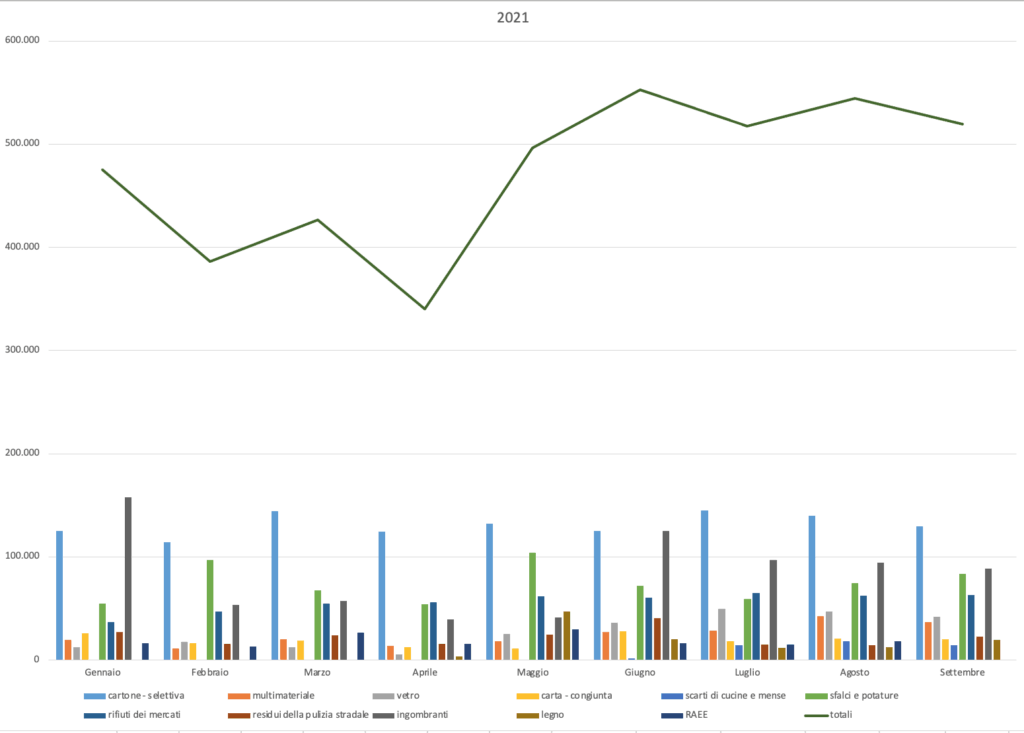 Analizzando i dati aggregati relativi al primo periodo, si può già notare un progressivo miglioramento della produzione di differenziata, che passa dal 7,31% del 2018 al 13,07% del 2020 con un incremento medio annuo pari a circa tre punti percentuali. Un balzo più deciso si registra nell’anno in corso: nei primi nove mesi del 2021 la raccolta differenziata si è attestata a poco meno del 18%, un dato che però è destinato a lievitare considerando la recente implementazione del servizio in varie aree della città, sia pure con una dotazione di mezzi e attrezzature non ancora ottimale.