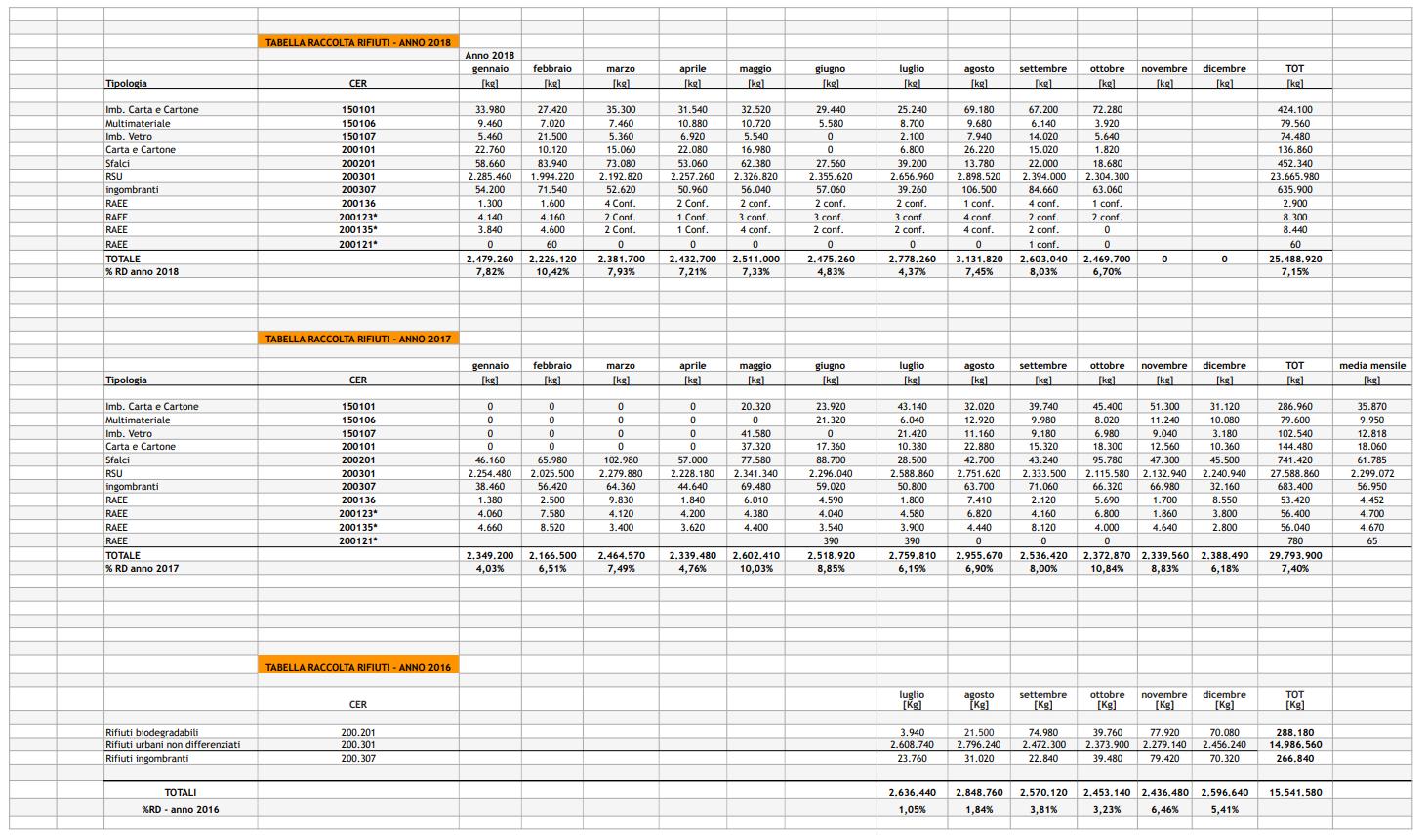 Nella tabella sottostante, le tonnellate di rifiuti raccolti da Akrea e conferiti agli impianti di trattamento RSU o in discarica negli ultimi anni, con la percentuale della raccolta differenziata su strada, avviata nel luglio 2016.
