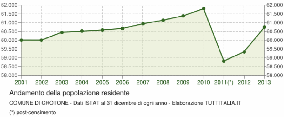 Crotone è il capoluogo della omonima Provincia. Crotone conta 60.741 abitanti, Crotonesi, e ha una superficie di 179,8 Kmq. per una densità abitativa di 330 abitanti per Kmq. Sorge a 8 metri sopra il livello del mare. Il comune di Crotone ha fatto registrare nel censimento del 1991 una popolazione pari a 59.001 abitanti. Nel censimento del 2001 ha fatto registrare una popolazione pari a 60.010 abitanti, mostrando quindi nel decennio 1991-2001 una variazione percentuale di abitanti pari all’1,71%; mentre nel 2013 si è raggiunto il valore superiore a 60.700 cittadini. I residenti sono distribuiti in circa 23.250 nuclei familiari con una media per nucleo familiare di 2,7 componenti. Il territorio del comune risulta compreso tra 0 e 186 metri sul livello del mare.